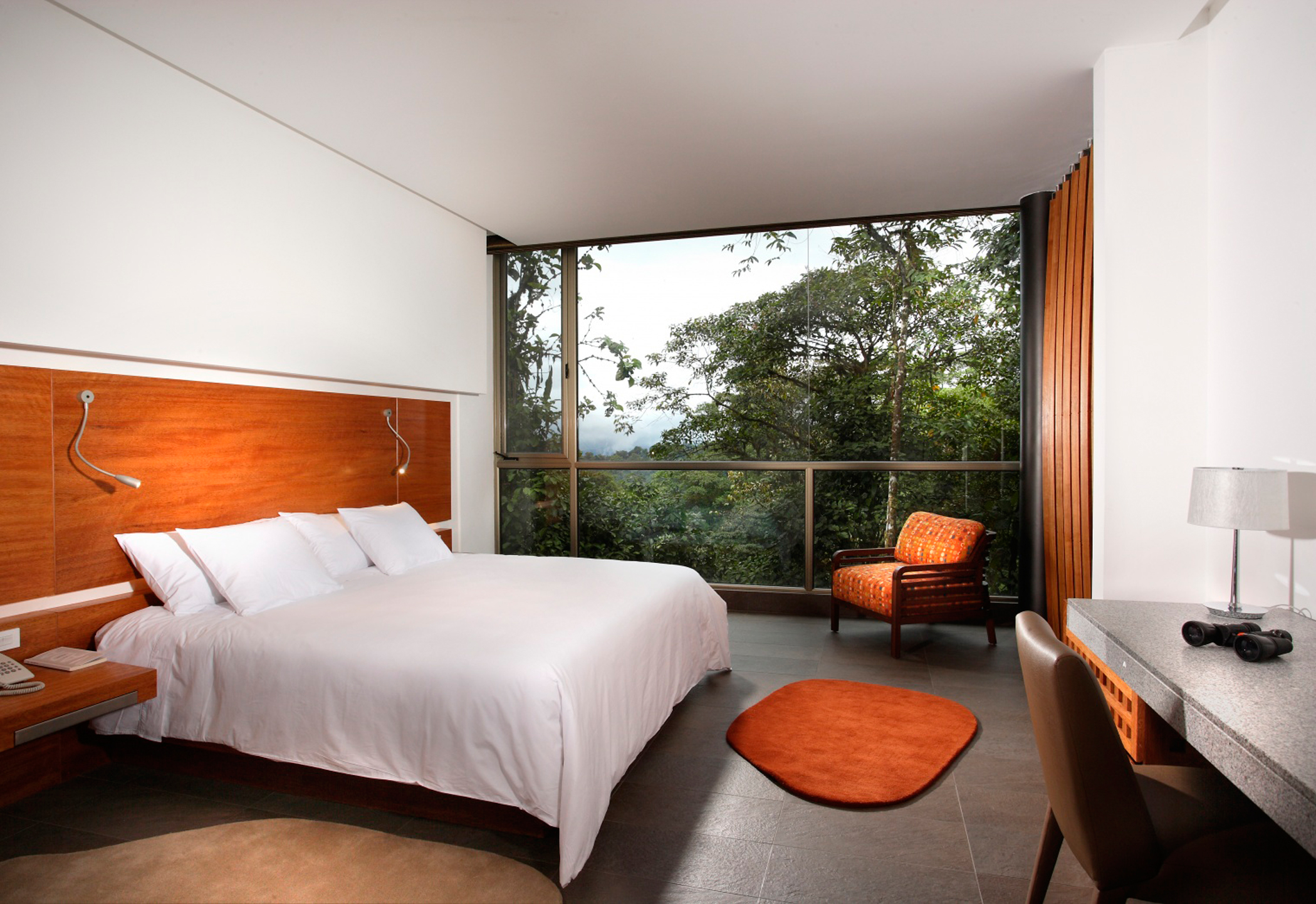 Внешнее и внутреннее оформление лоджа выполнено в стильном и современном ключе. Благодаря панорамным окнам, стеклянным перегородкам и перилам и минимуму обстановки кажется, что помещения наполнены светом и воздухом. Однако главная изюминка Mashpi Lodge – это не дизайн, а многочисленные программы и экскурсии по тропическому лесу, которые организуют сотрудники отеля.